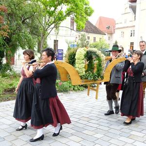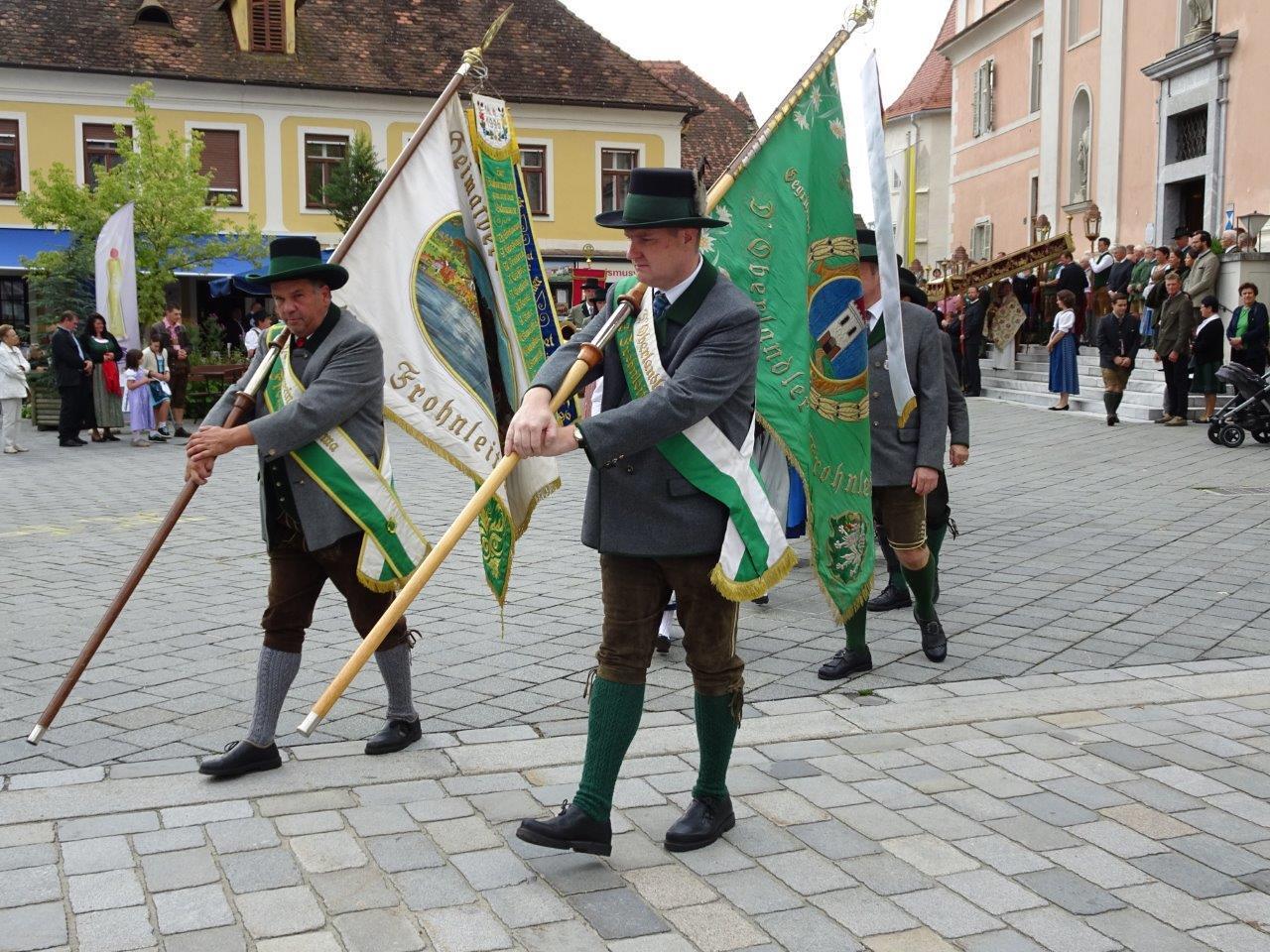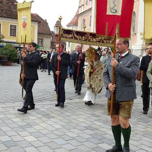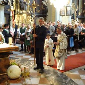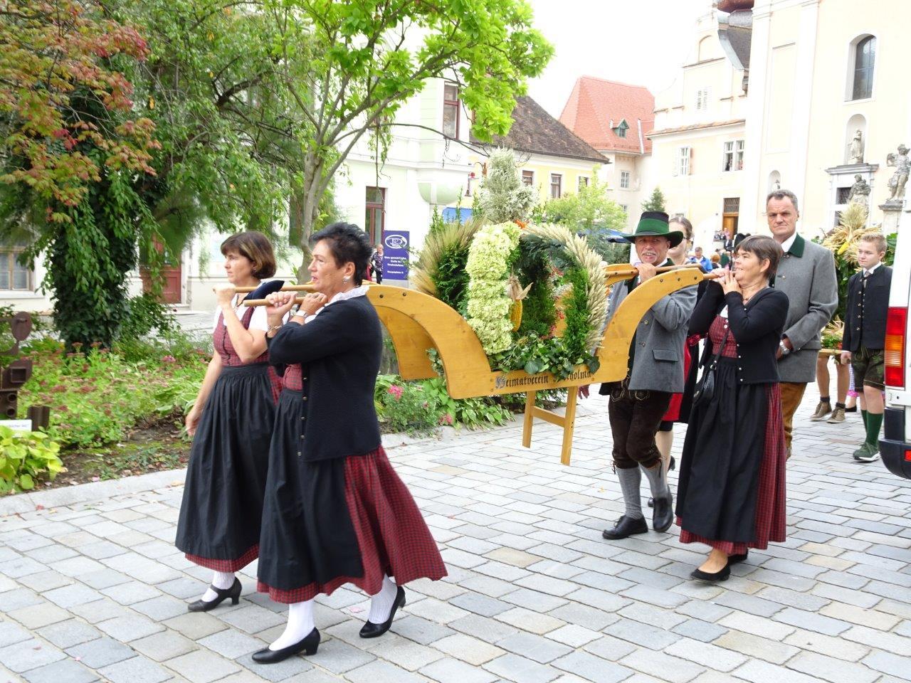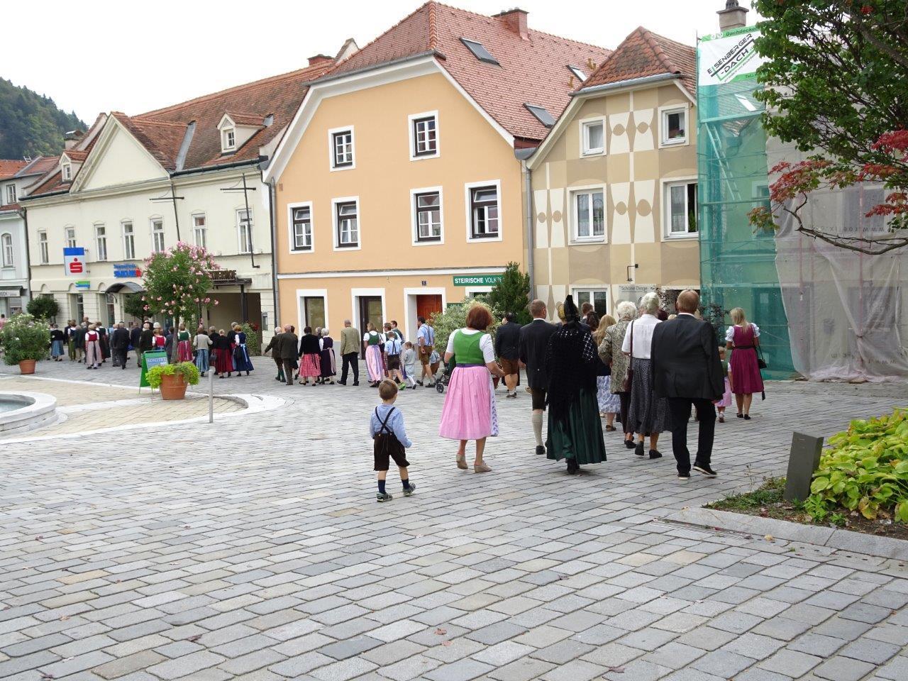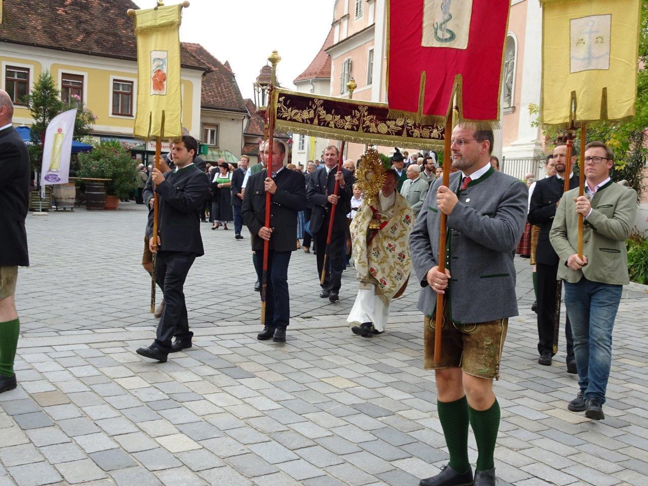 Nach der Segnung der Erntegaben folgte die Erntedankprozession mit Beteiligung der örtlichen Vereine und des Musikvereines Röthelstein sowie unter reger Teilnahme der Gläubigen über den gesamten Hauptplatz. Anschließend wurde dann der feierliche Lobgesang "Te Deum" gesungen. In der Pfarrkirche waren nach altem Brauchtum drei Erntekronen vorhanden, und zwar eine von den Bäuerinnen unter Anleitung von Anni Plienegger, eine von der Landjugend und eine vom Heimatverein Hocholma hergestellt.