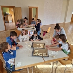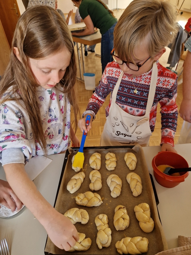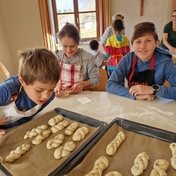 Am 31. Oktober fanden sich auch heuer wieder viele große und kleine Bäckerinnen und Bäcker im Pfarrheim ein, um aus 12 kg Germteig herrliche Allerheiligenstriezerl zu formen. Sieben Erwachsene sowie alle Minis und eventuell zukünftige Minis (insgesamt 16 Kinder) waren von 9 -11 Uhr mit Feuereifer dabei.
