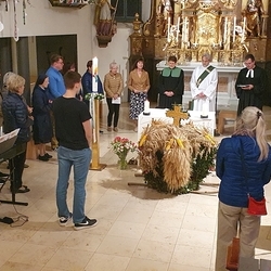 Von der schwungvollen Musik unserer Musikgruppe begeistert, sangen wirklich alle gerne mit, vom  Kirchenchor bis zu den VS-Kindern, deren besonderer Erntedankschmuck übrigens nun die Empore im Altarraum ziert.