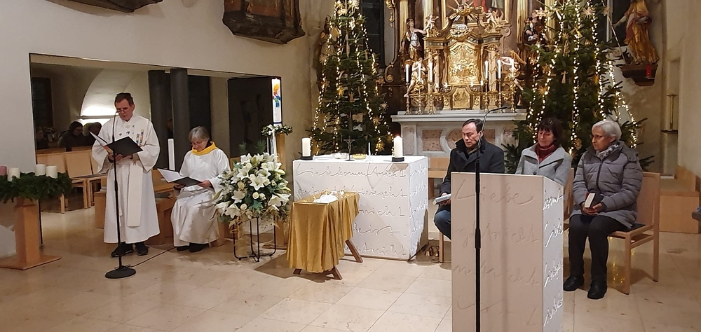 Bei der Wort-Gottes-Feier am Sonntag sprach WGF-Leiterin Christa Habith in Bezug auf Jesaja von der uralten Sehnsucht der Menschen nach Frieden und Gerechtigkeit. Nur durch Umkehr, siehe Johannes der Täufer (Mt 3, 1-12), kann Veränderung geschehen und Gott in uns ankommen. Umkehren heißt Haltungen überdenken, Altes verlassen und die Herzen öffnen.