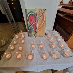 Vor dem Altar brannten 59 Teelichter für alle Menschen, die im letzten Jahr in unserer Pfarre verstorben sind. Ihre Namen wurden noch einmal laut ausgesprochen. Ein Teelicht leuchtete für alle Verstorbenen, die ungenannt blieben.