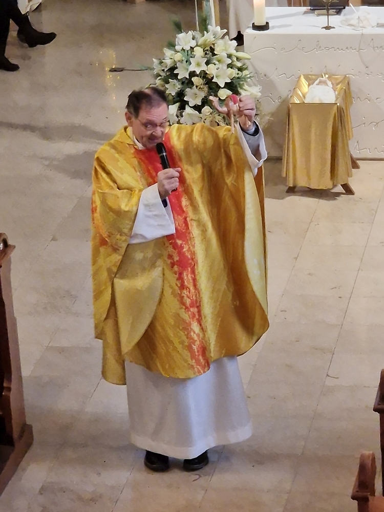 Vor dem Schlusssegen überreichte Ernst Pock im Namen der Pfarre dem neuen Diakon ein Aspergill, mit dem dieser gleich voll Freude die Gläubigen segnete. Für seine Ehefrau Eva, die ihm begleitend zur Seite steht, gab es einen Blumenstrauß, mit den besten Wünschen für sie.